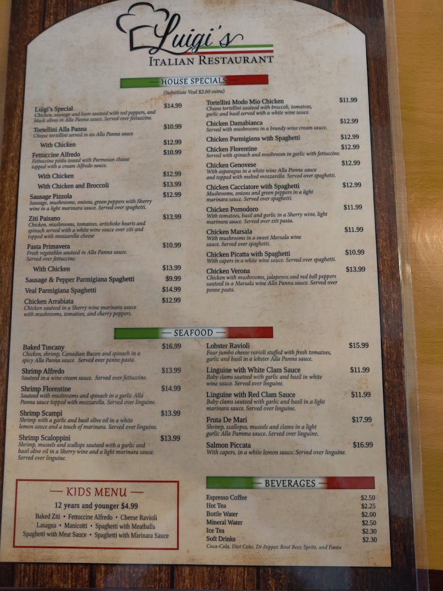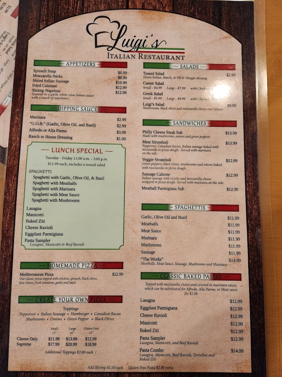 With customer favorites like Chicken Alfredo and hearty spinach soup, Luigi's captures the essence of Italian dining. It's a place where every meal is an invitation to indulge.